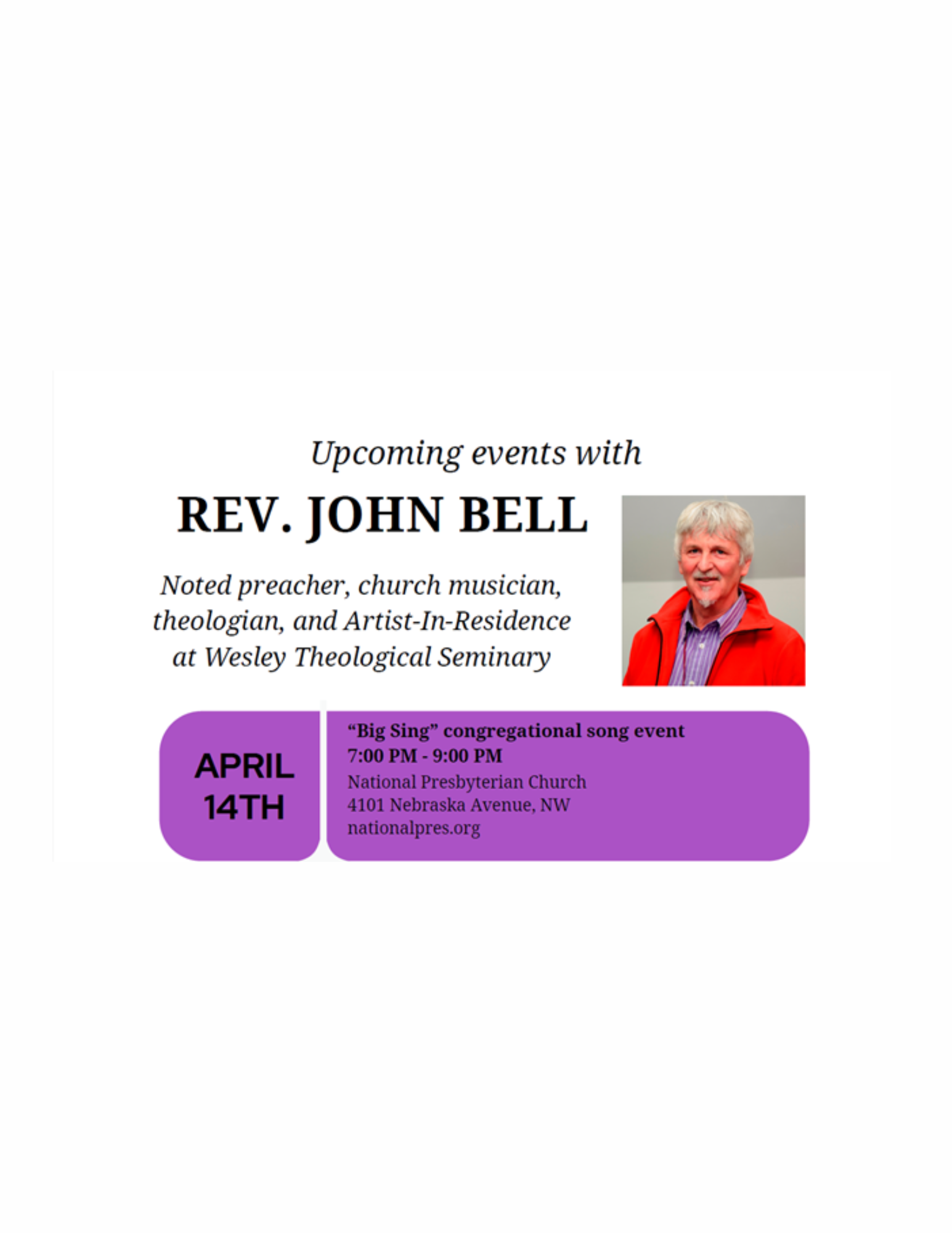 National Presbyterian Church 4101 Nebraska Ave NW,, Washington, DC, United StatesSponsored by the Henry Luce III Center for the Arts at Wesley Theological Seminary, this is one of our four events with noted Scottish hymn writer and theologian, John Bell. It is called the "Big Sing" with John Bell, an event in which John will talk about worship, hymnody, and provide some insights and tips…