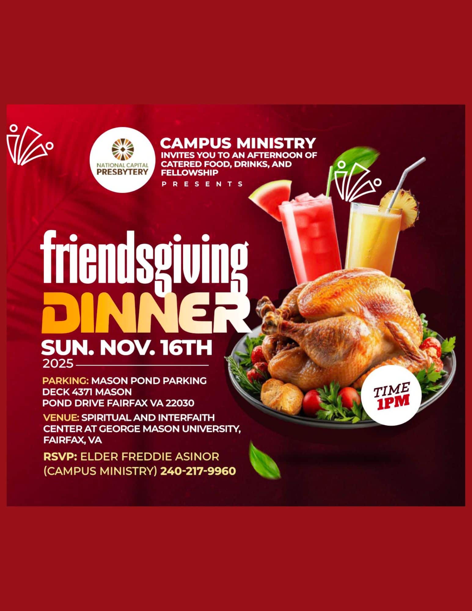 Spiritual and Interfaith Center 4400 University Drive, Fairfax, VA, United StatesNational Capital Presbytery's Campus Ministry team invites George Mason's students to an afternoon of catered food, drinks and fellowship Sunday, November 16, 2025 at 1:00 PM Spiritual and Interfaith Center George Mason University Fairfax, VA Parking: Mason Pond Parking Deck - 4371 Mason Pond Drive, Fairfax, VA 22030